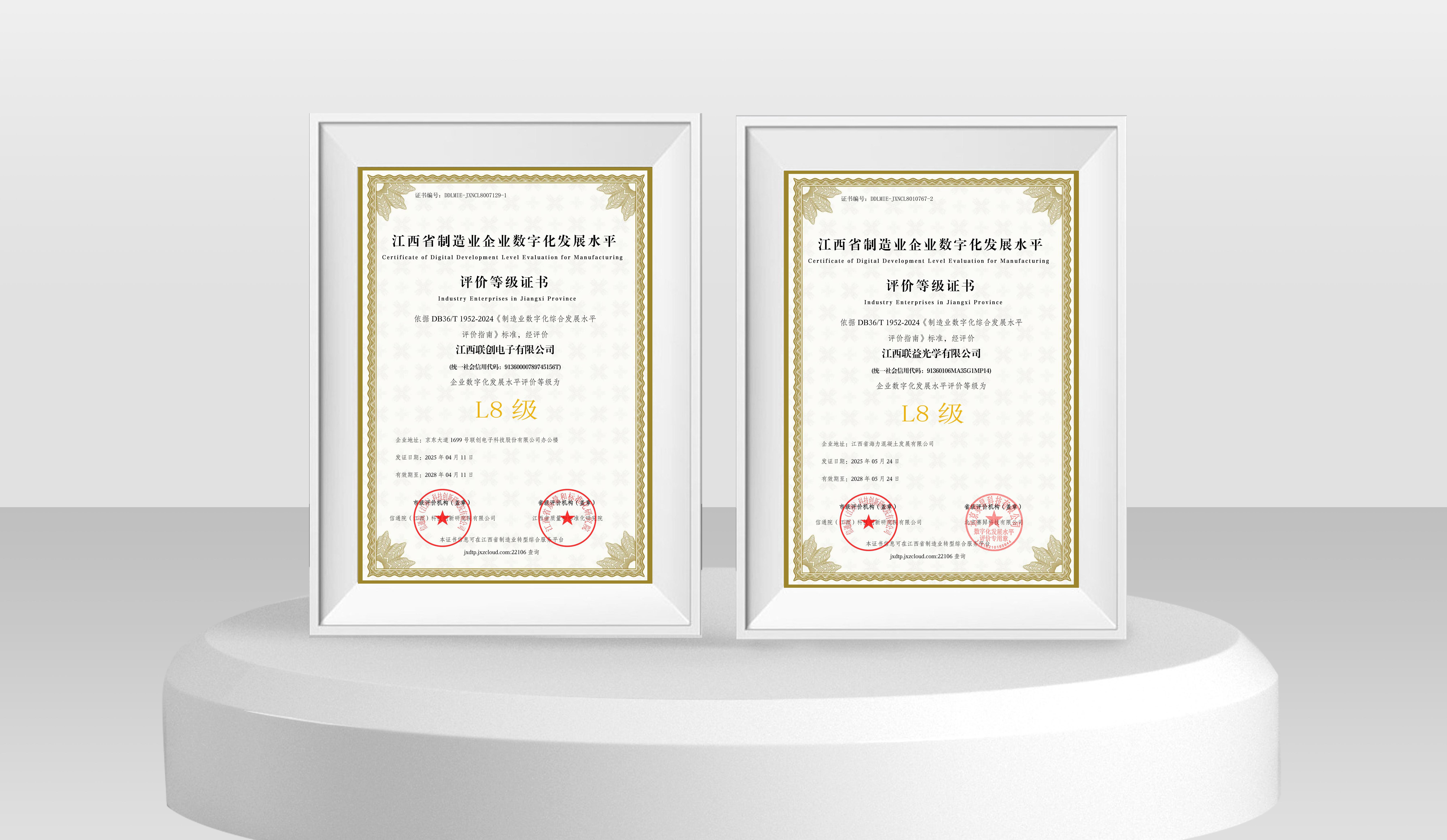 近日,联创电子科技股份有限公司旗下江西联创电子有限公司(以下简称江西联创)与江西联益光学有限公司(以下简称江西联益)凭借深度集成与创新应用能力,在江西省制造业企业数字化发展水平等级评价中双双达到L8级水平,标志着两家企业在数字化转型领域已跻身全省“集成提升阶段”最高水平,为全省制造业智能化升级树立新标杆。